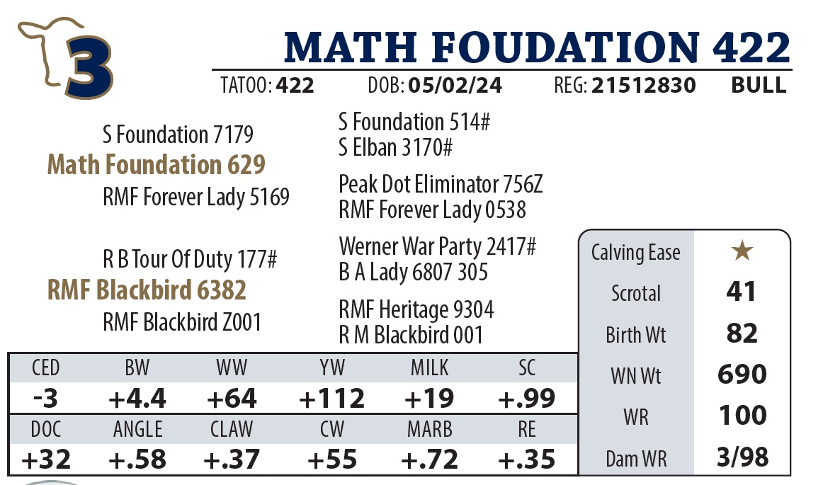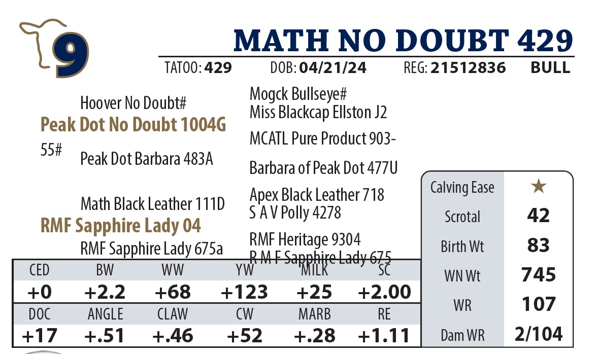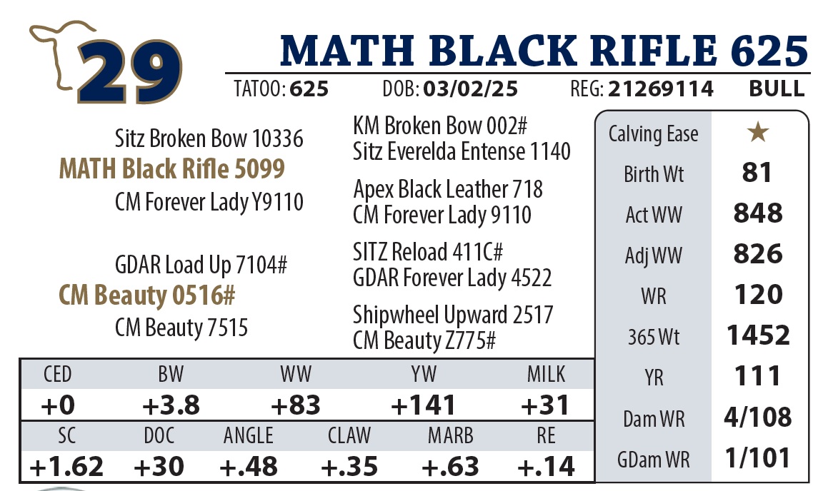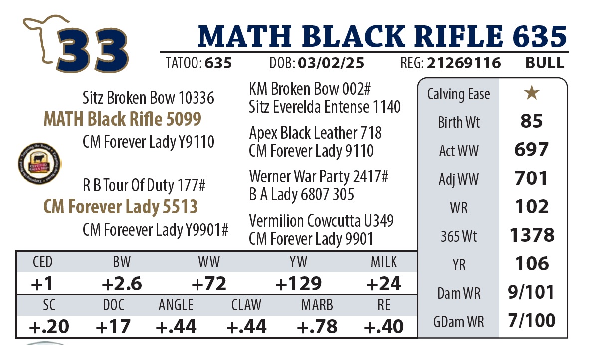 | MATH BLACK RIFLE 625 | 29Y | YEARLING BULL | Our Weaning Weight Champion. Sired by Black Rifle, performance is bred-in. Pathfinder dam of this bull has sold two top selling bulls in the past couple years. |