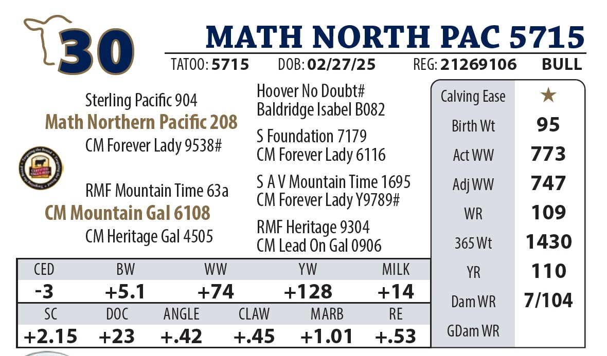| MATH NORTH PAC 5715 | 30Y | YEARLING BULL | You won’t miss this beast in the pen. A personal favorite expected to sire heavy steers and high-quality replacements. The sire of this bulls dam is a son of donor cow Forever Lady Y9789 |