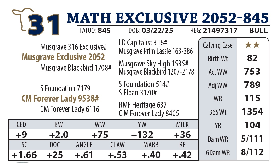 | MATH EXCLUSIVE 2052-845 | 31Y | YEARLING BULL | A younger bull that refuses to be ignored. He shares the same dam as Northern Pacific, Forever Lady 9538, and has kept up with the “big boys” all year. |