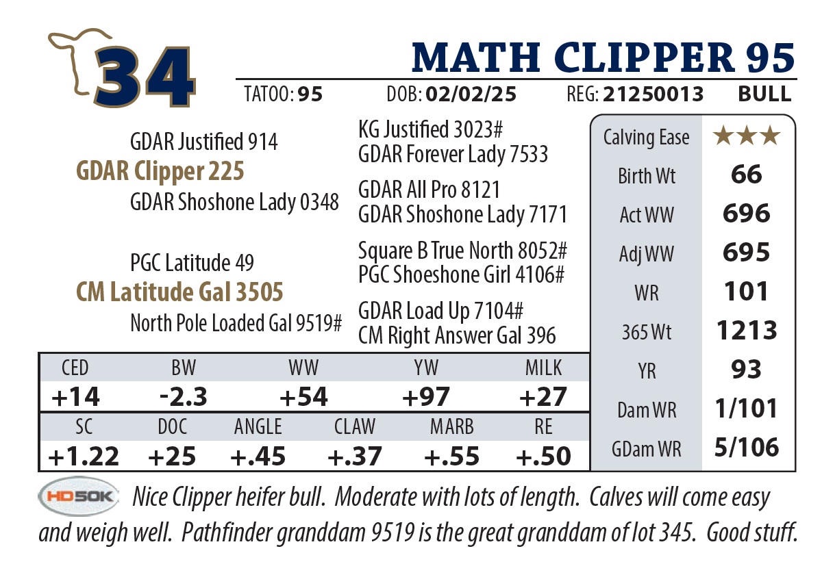 | MATH CLIPPER 95 | 34Y | YEARLING BULL | Nice Clipper heifer bull. Moderate with lots of length. Calves will come easy and weigh well. Pathfinder granddam 9519 is the great granddam of lot 345. Good stuff. |