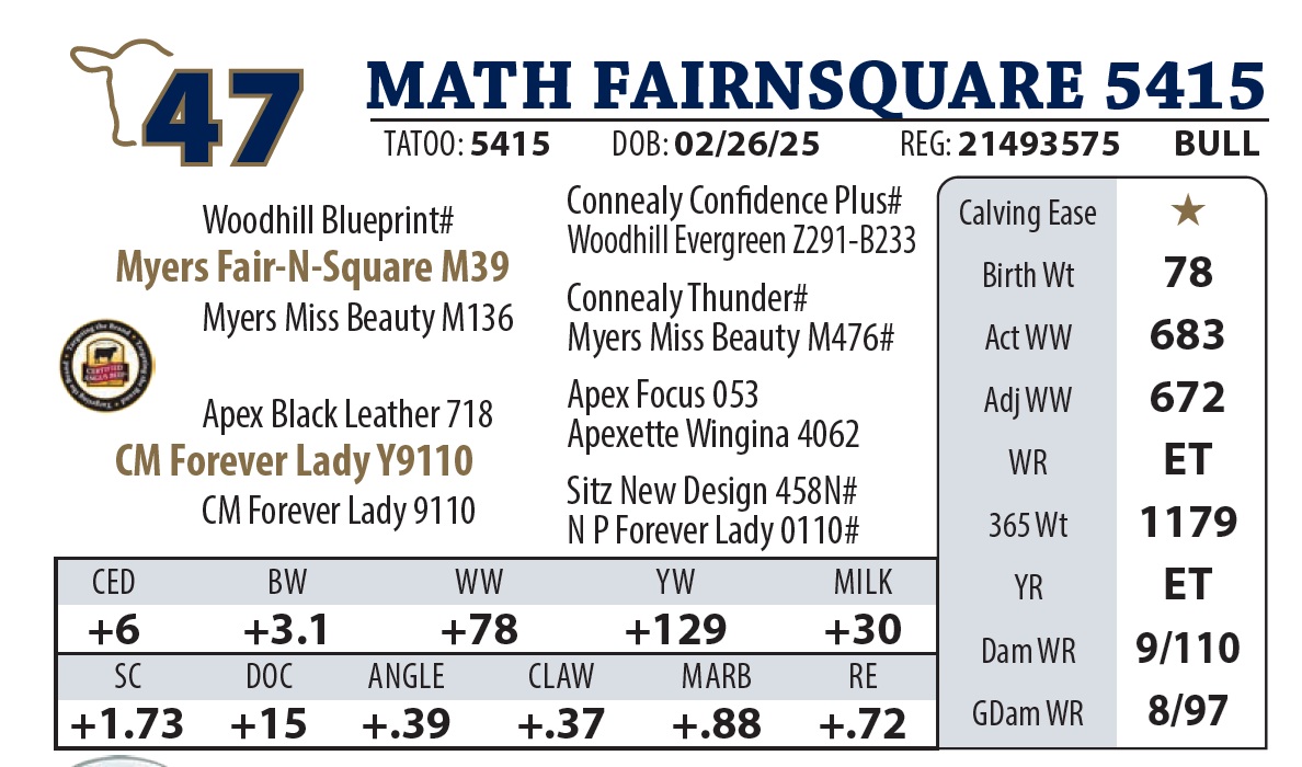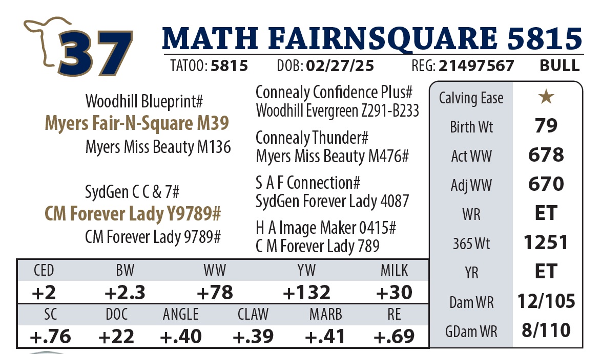 | MATH FAIRNSQUARE 5815 | 37Y | YEARLING BULL | This is the flush brother to Lot 8, from Forever Lady Y9789. You’ll like these two bulls. |