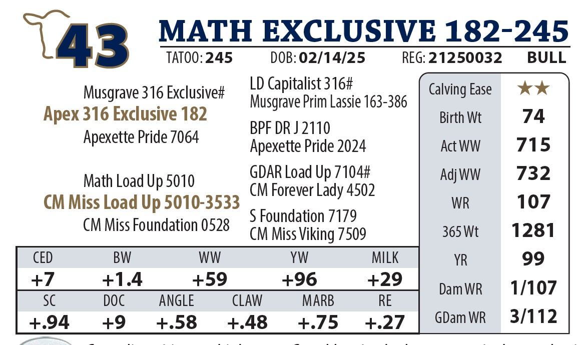 | MATH EXCLUSIVE 182-245 | 43Y | YEARLING BULL | Great disposition on this bugger. Granddam is a badass cow, notice her production records. Love the udder on her. |