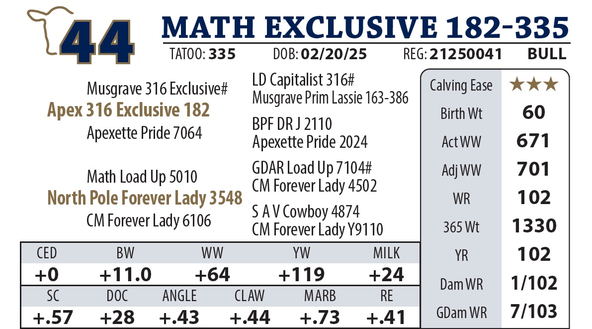 | MATH EXCLUSIVE 182-335 | 44Y | YEARLING BULL | Good bull. Dam did a great job. She is maternal sister to lot 4445, the performance test winner of this offering! Great Granddam is Y9110. |