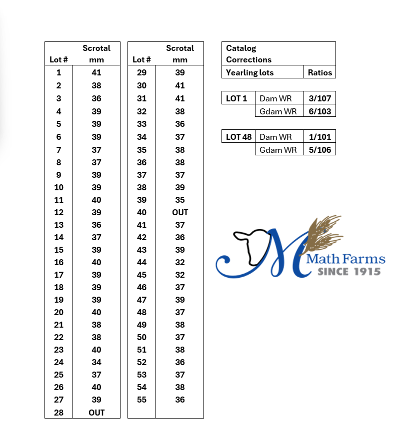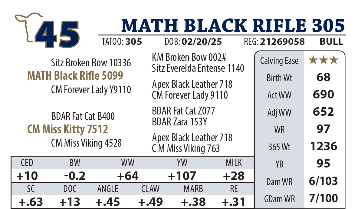 | MATH BLACK RIFLE 305 | 45Y | YEARLING BULL | Pretty good bull later in the sale. Dam of this bull is the granddam of our Lot 1 this year. This cow sired the high selling bull in our 2023 sale. I think so highly of her, she’s actually the first cow I renamed. |