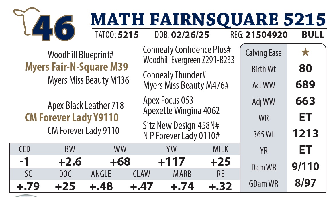 | MATH FAIRNSQUARE 5215 | 46Y | YEARLING BULL | Two embryo transfer brothers from Y9110 back to back. I’ll be honest, their recip mothers didn’t do them any favors, but they have gained very well once they went on test. The pedigree is full of performance, don’t sleep on these two. |