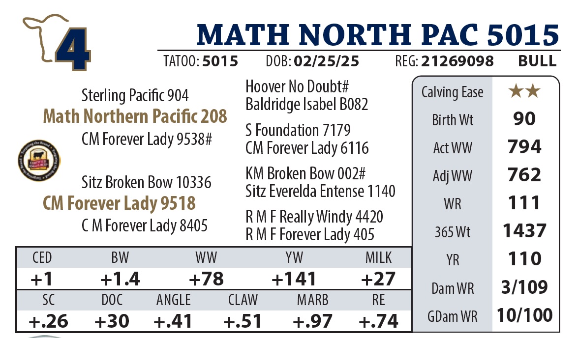 | MATH NORTH PAC 5015 | 4Y | YEARLING BULL | This bull checks all the boxes. A high-octane performance bull with a pedigree “stacked” for maternal excellence. By doubling up on the Forever Lady 6116 and 9518 lines(maternal sisters), we’ve ensured this bull has the genetic horsepower to sire elite females. |