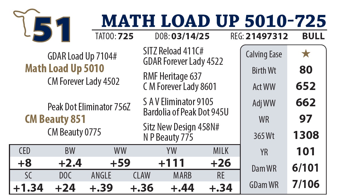 | MATH LOAD UP 5010-725 | 51Y | YEARLING BULL | Load up 5010 is a son from a cow I regard as one of the most fertile cows we have. His daughters seem to reflect that. Most seem to breed first cycle and none have ever been open so far! |