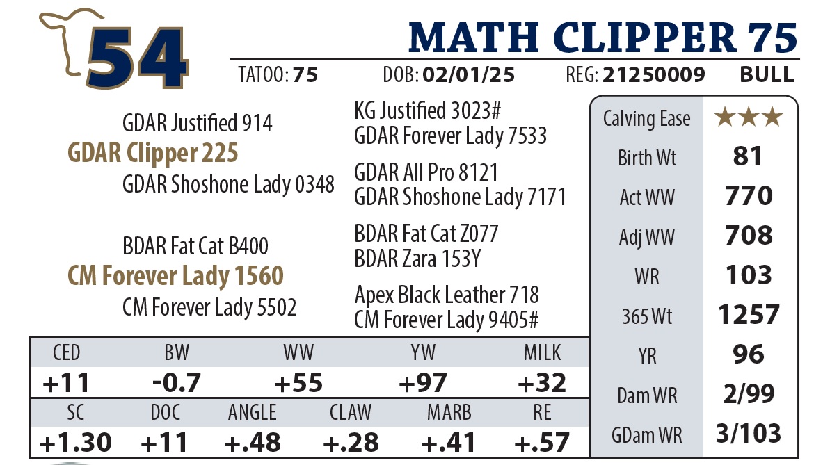 | MATH CLIPPER 75 | 54Y | YEARLING BULL | |