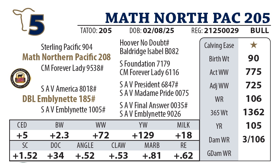 | MATH NORTH PAC 205 | 5Y | YEARLING BULL | A personal favorite. His dam is a model Angus female—long, deep, and perfect-footed—who earned Pathfinder honors the first year she was eligible. She’s already back at work with another stout bull calf at her side. |