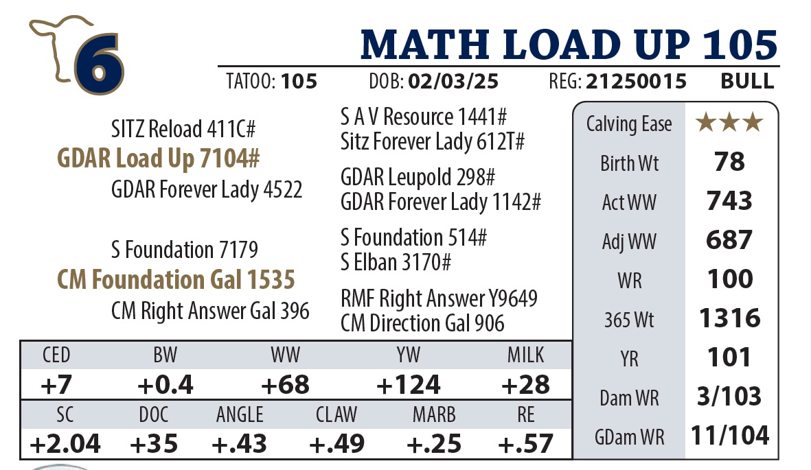 | MATH LOAD UP 105 | 6Y | YEARLING BULL | Strong topped Load Up heifer bull. Another nice bull from a Foundation 7179 cow. Granddam is still here at age 13 with calf at her side. |