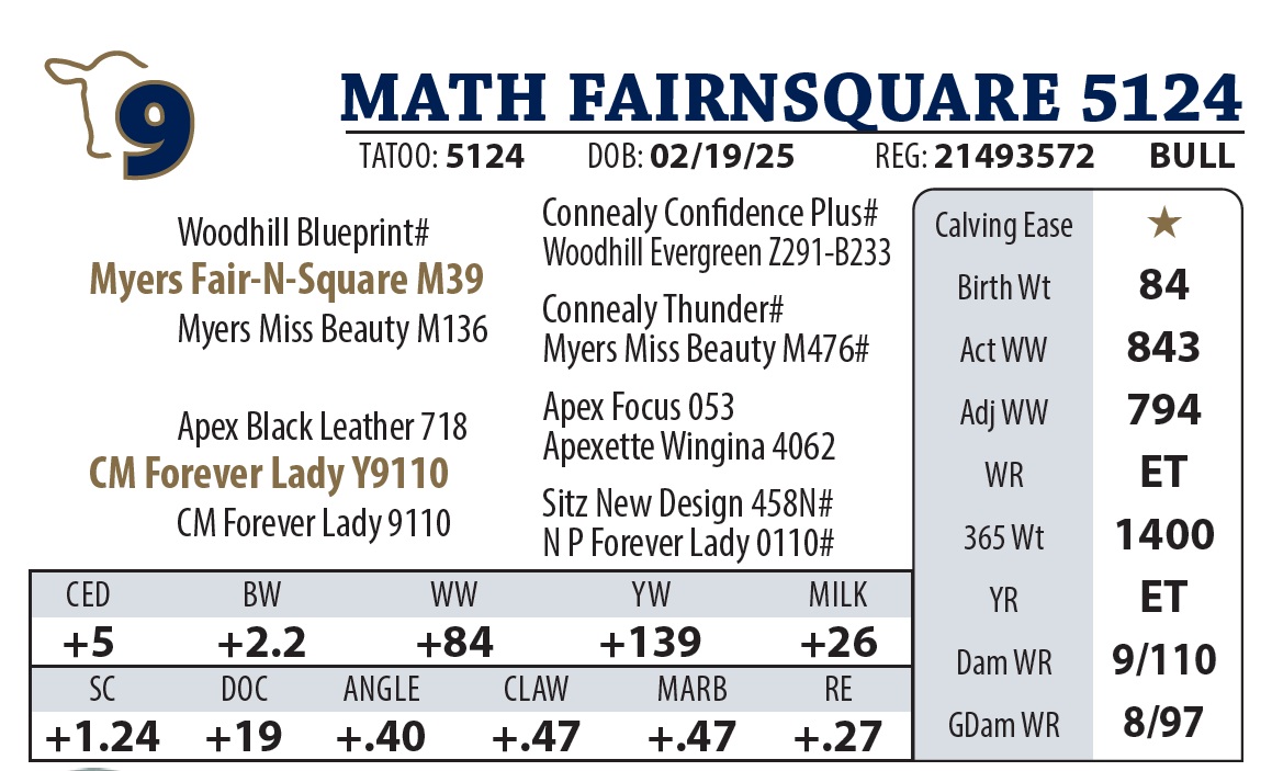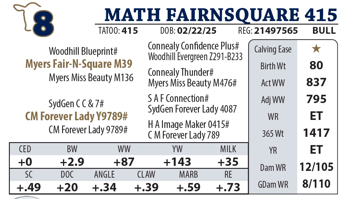 | MATH FAIRNSQUARE 415 | 8Y | YEARLING BULL | Powerful Embryo transfer bull and real sale feature. These bulls are stout-made with added bone and excellent hoof quality. They represent the first offering from our donor Y9789, a cow we targeted for flush work because of her perfect udder and structural integrity |