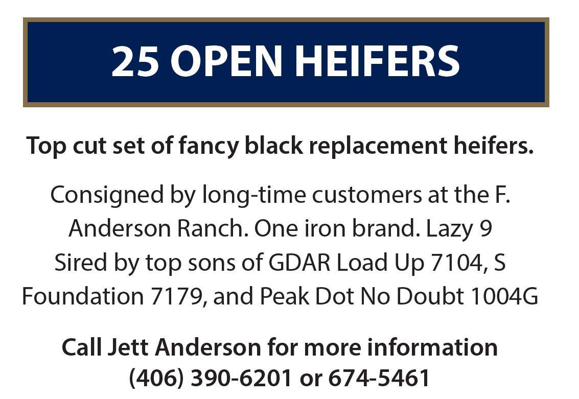 | 25 OPEN HEIFERS | 2H | 25 OPEN HEIFERS | Top cut set of fancy bla ck replacement heifers. Consigned by long-time customers at the F. Anderson Ranch. One iron brand. Lazy 9 Sired by top sons of GDAR Load Up 7104, S Foundation 7179, and Peak Dot No Doubt 1004G |