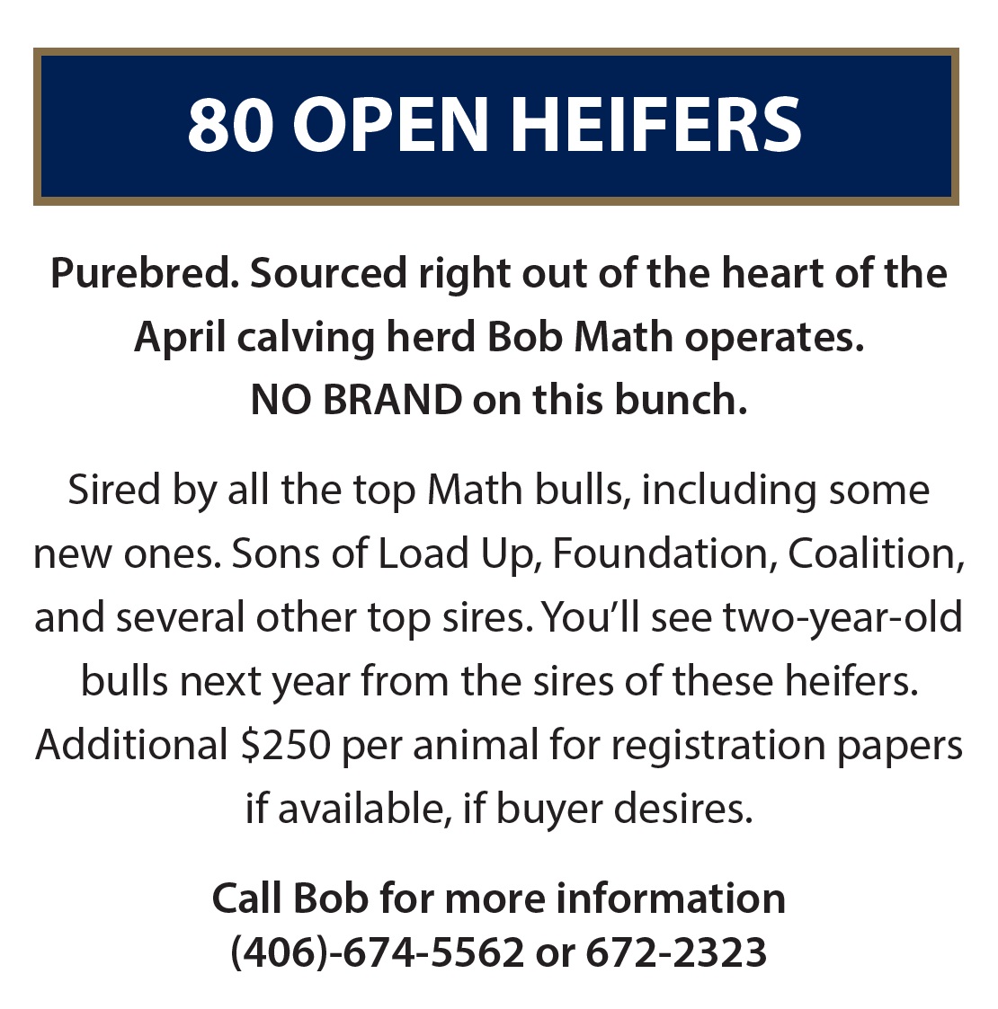 Purebred. Sourced right out of the heart of the April calving herd Bob Math operates. NO BRAND on this bunch. Sired by all the top Math bulls, including some new ones. Sons of Load Up, Foundation, Coalition, and several other top sires. You’ll see two-year-old bulls next year from the sires of these heifers. Additional $250 per animal for registration papers if available, if buyer desires.