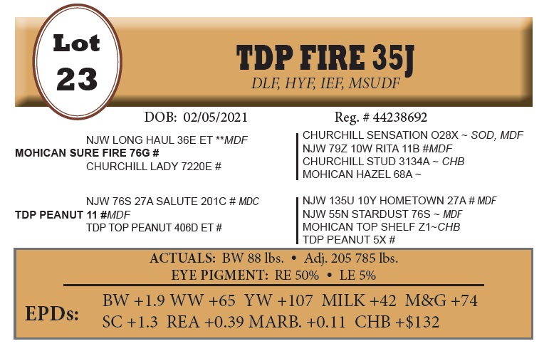 | TDP WILL 73K | 23 | Hereford Bull | DOB: 2/20/2022 Scurred Reg. # 44351585 |