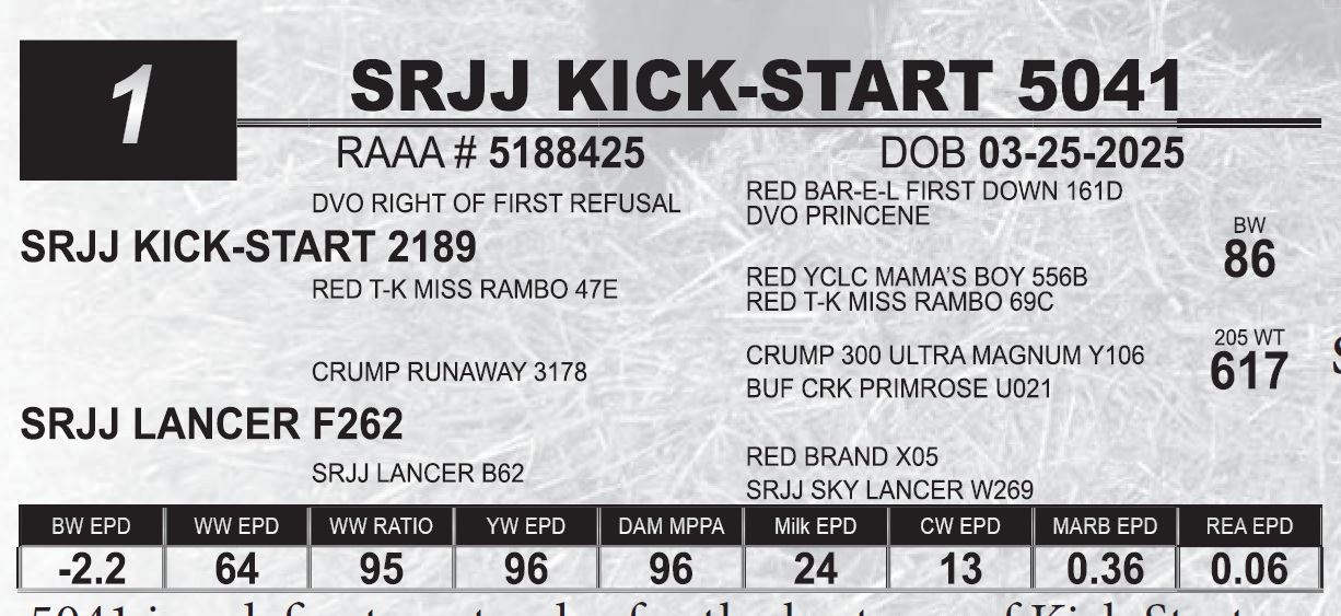 | SRJJ KICK-START 5041 | 1 | Red Angus Yearling Bull | 5041 is a de ant contender for the best son of Kick Start 2189. His dam is a beautiful cow that has one of the best udders in our whole herd. Don’t be fooled by his numbers, 5041 has as much growth and performance as any bull calf that will sell this year. SELLING 1/2 POSSESSION AND 1/2 SEMEN INTEREST |