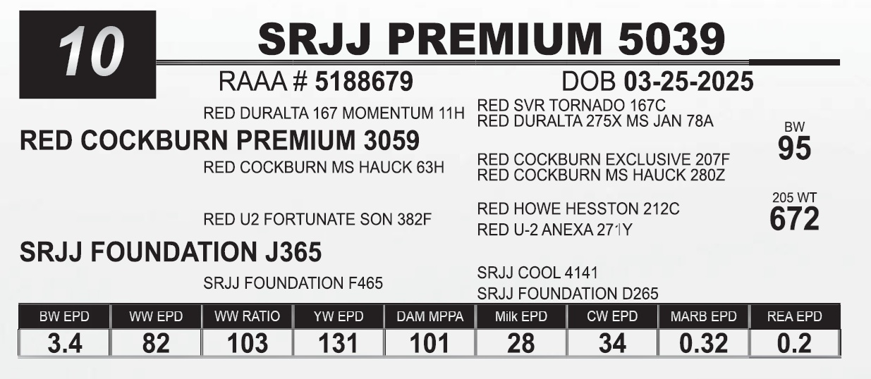 | SRJJ PREMIUM 5039 | 10 | Red Angus Yearling Bull | |