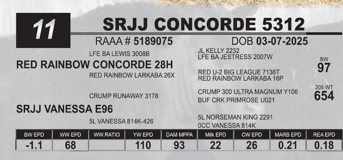| SRJJ CONCORDE 5312 | 11 | Red Angus Yearling Bull | |