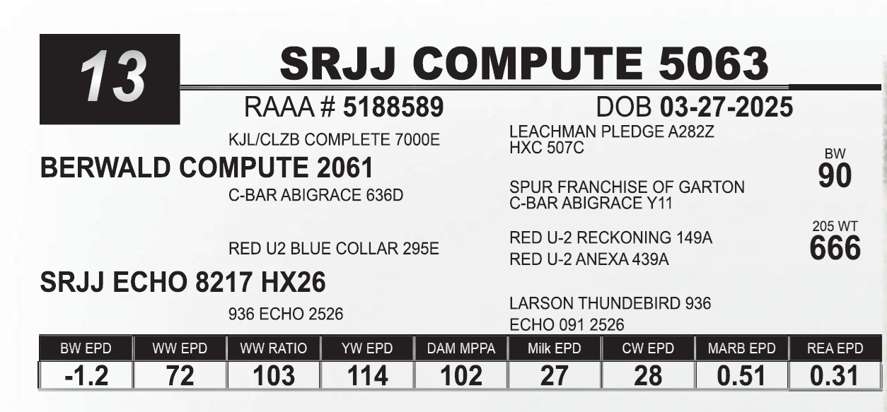 | SRJJ COMPUTE 5063 | 13 | Red Angus Yearling Bull | |