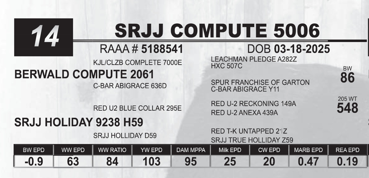 | SRJJ COMPUTE 5006 | 14 | Red Angus Yearling Bull | |