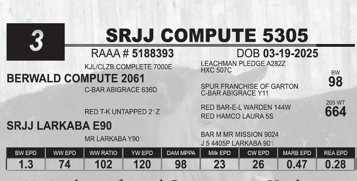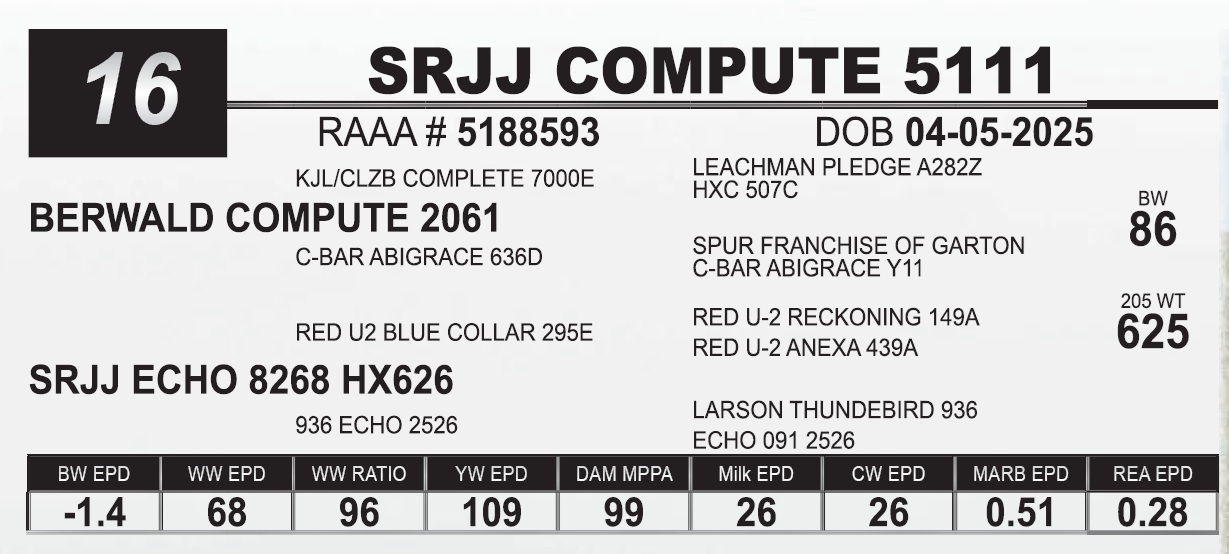 | SRJJ COMPUTE 5111 | 16 | Red Angus Yearling Bull | |