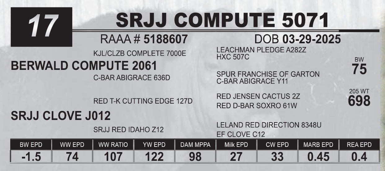 | SRJJ COMPUTE 5042 | 15 | Red Angus Yearling Bull | |