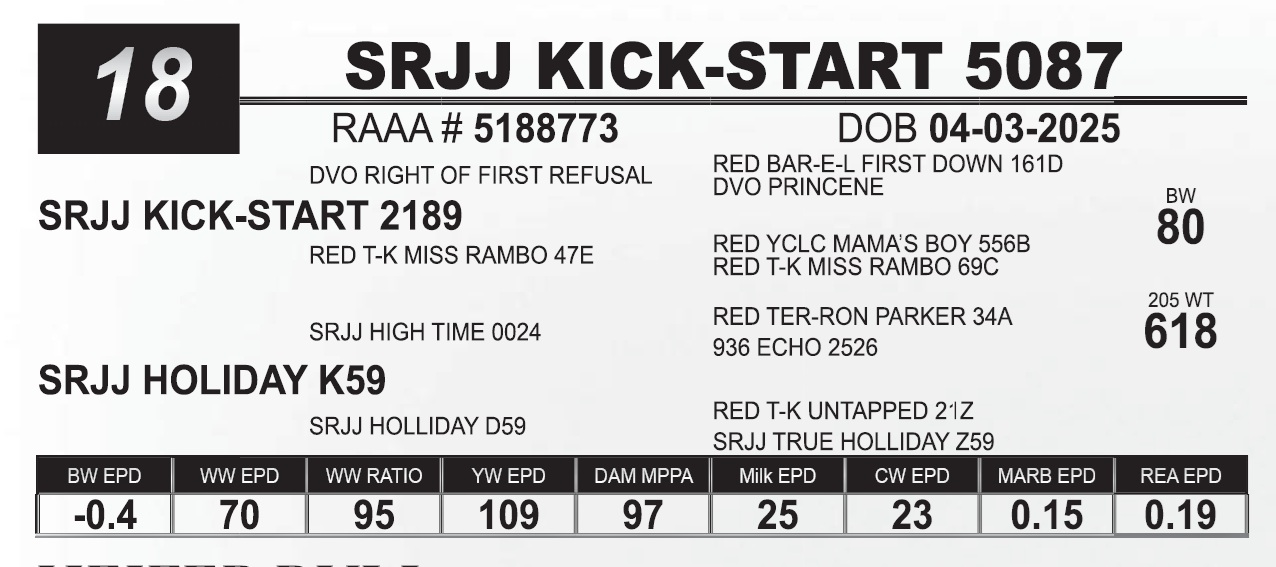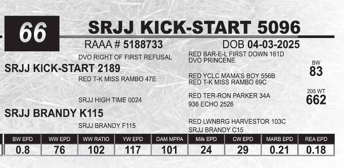 | SRJJ KICK-START 5096 | 66 | Red Angus Yearling Bull | |