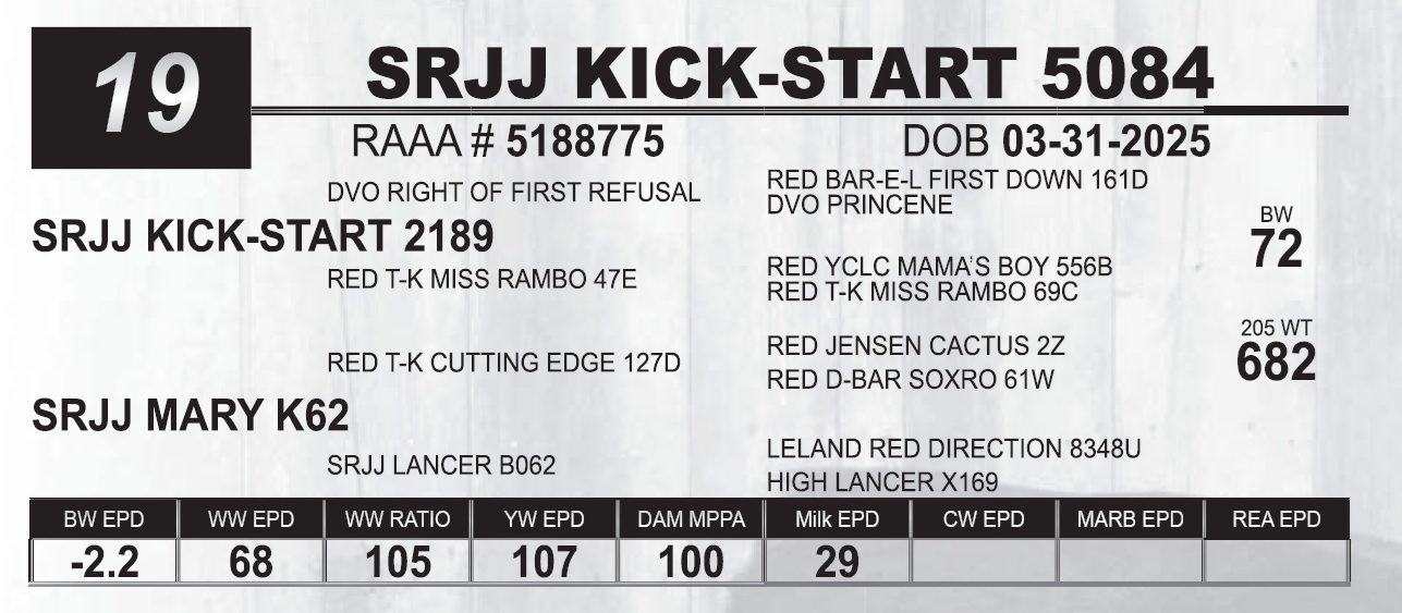 | SRJJ KICK-START 5084 | 19 | Red Angus Yearling Bull | HEIFER BULL |