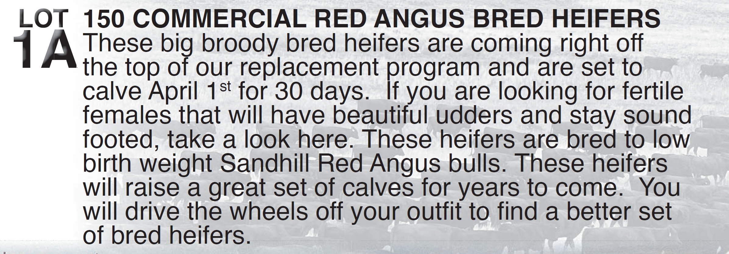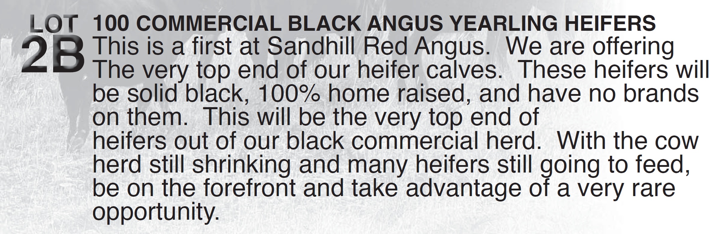 | 100 COMMERCIAL BLACK ANGUS YEARLING HEIFERS | 2B | COMMERCIAL BLACK ANGUS YEARLING HEIFERS | This is a fi rst at Sandhill Red Angus. We are offering The very top end of our heifer calves. These heifers will be solid black, 100% home raised, and have no brands on them. This will be the very top end of heifers out of our black commercial herd. With the cow herd still shrinking and many heifers still going to feed, be on the forefront and take advantage of a very rare opportunity. |