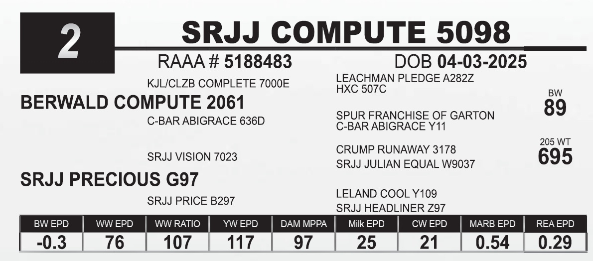 | SRJJ COMPUTE 5098 | 2 | Red Angus Yearling Bull | A stylish bull that stands down on an extremely wide base. We believe that muscle shape and base width needs more attention within the breed. His dam G97 is a larger framed cow that flat produces. |