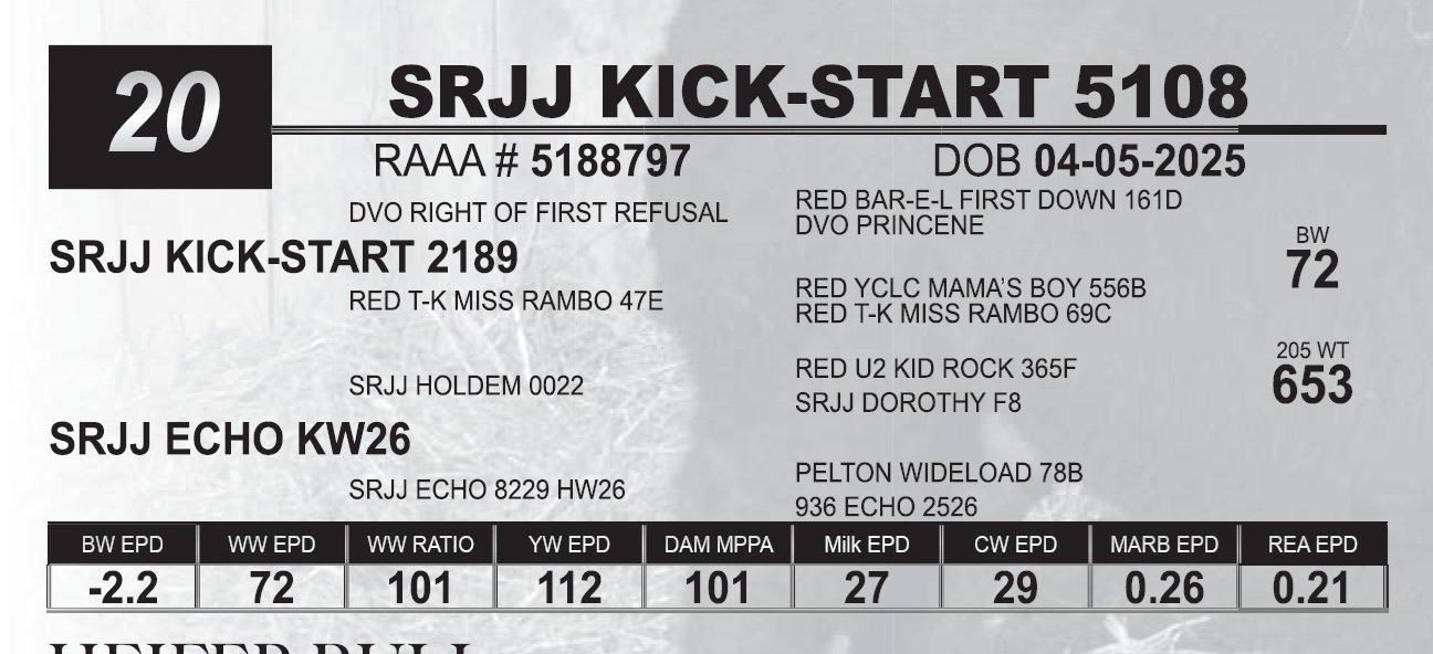 | SRJJ KICK-START 5108 | 20 | Red Angus Yearling Bull | HEIFER BULL |