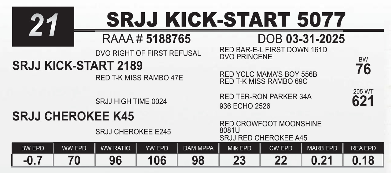 | SRJJ KICK-START 5077 | 21 | Red Angus Yearling Bull | HEIFER BULL |