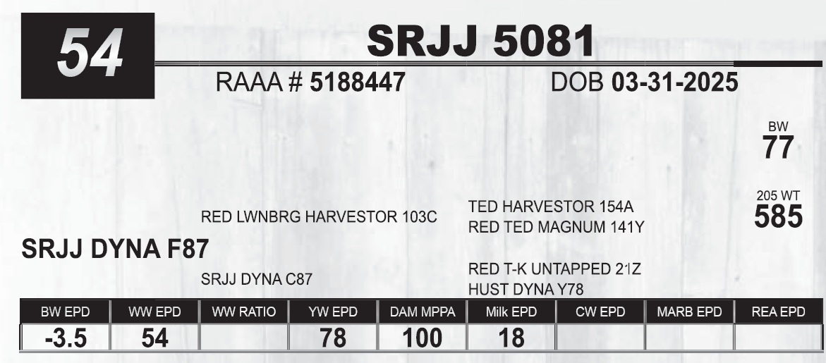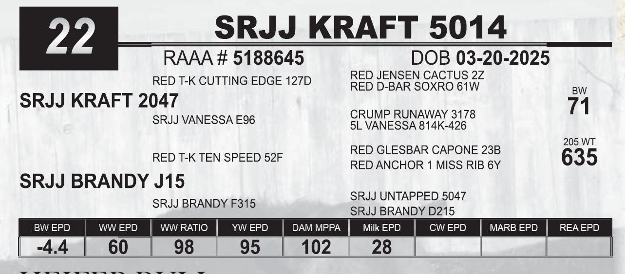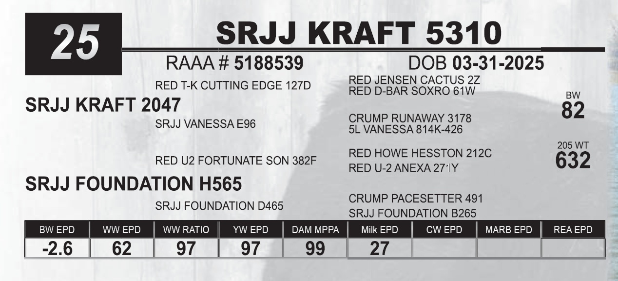 | SRJJ KRAFT 5310 | 25 | Red Angus Yearling Bull | |