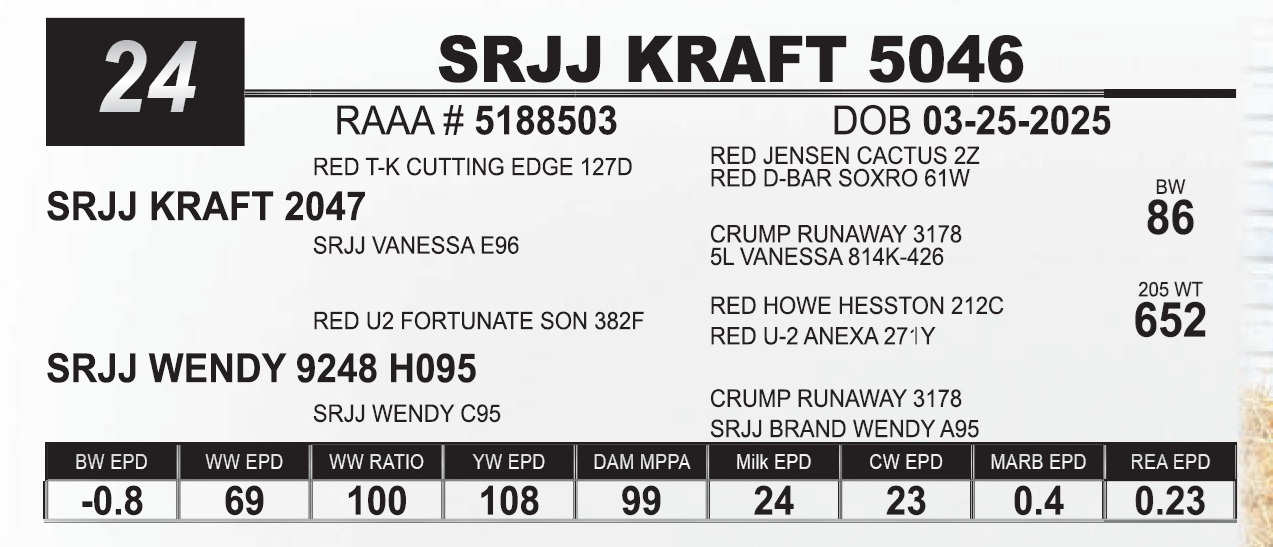 | SRJJ KRAFT 5046 | 24 | Red Angus Yearling Bull | |