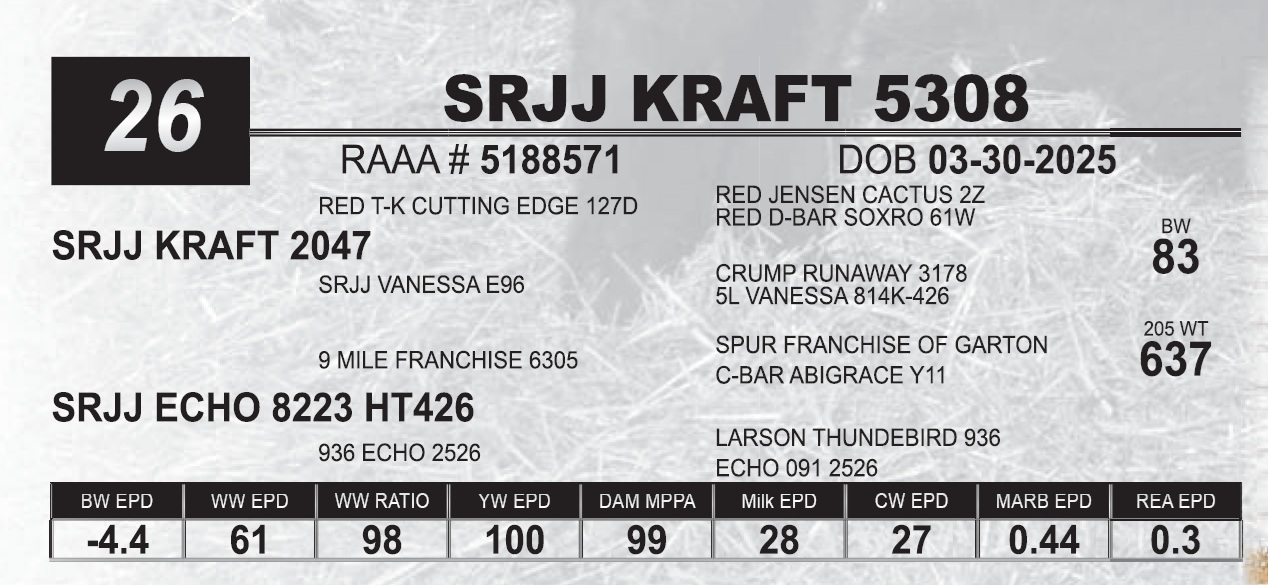 | SRJJ KRAFT 5308 | 26 | Red Angus Yearling Bull | |