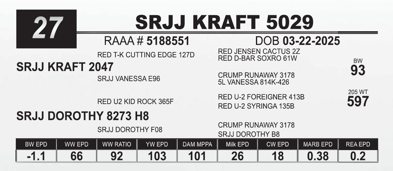 | SRJJ KRAFT 5029 | 27 | Red Angus Yearling Bull | |