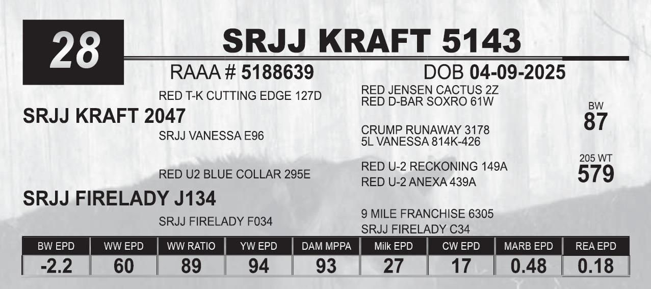 | SRJJ KRAFT 5143 | 28 | Red Angus Yearling Bull | |