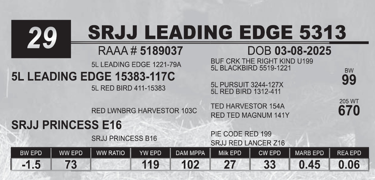| SRJJ LEADING EDGE 5313 | 29 | Red Angus Yearling Bull | |