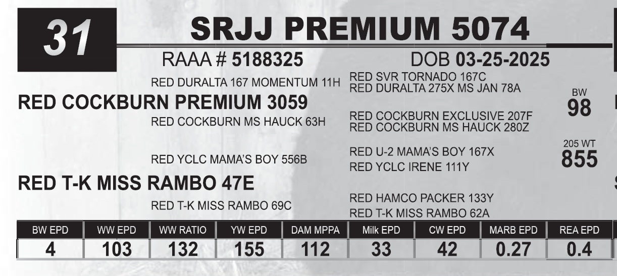 | SRJJ PREMIUM 5074 | 31 | Red Angus Yearling Bull | |