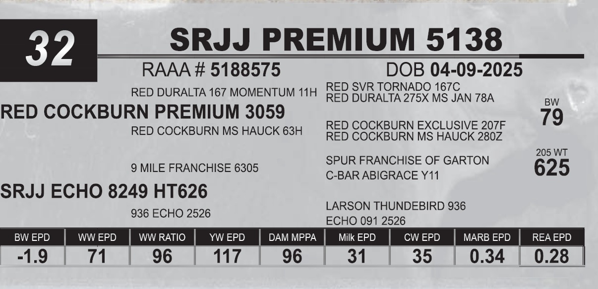 | SRJJ PREMIUM 5138 | 32 | Red Angus Yearling Bull | |