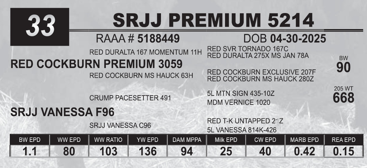| SRJJ PREMIUM 5214 | 33 | Red Angus Yearling Bull | |