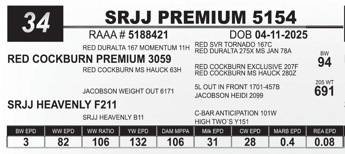 | SRJJ PREMIUM 5154 | 34 | Red Angus Yearling Bull | |