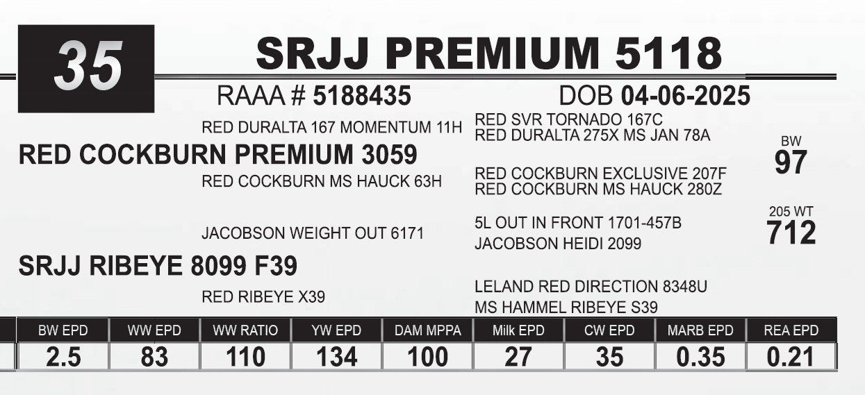 | SRJJ PREMIUM 5118 | 35 | Red Angus Yearling Bull | |