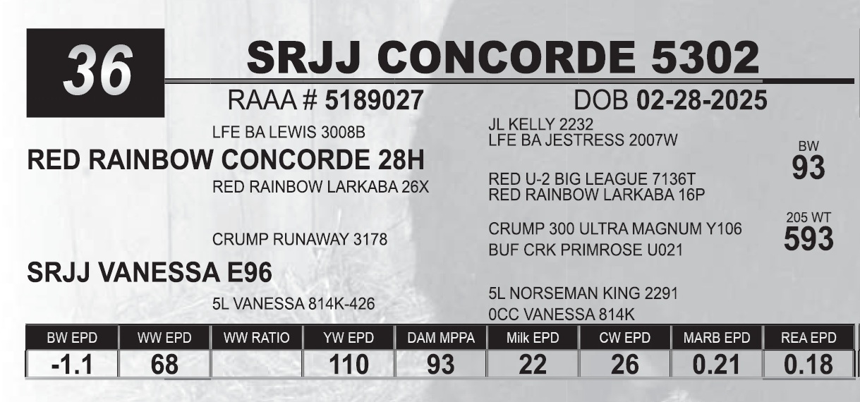 | SRJJ CONCORDE 5302 | 36 | Red Angus Yearling Bull | |