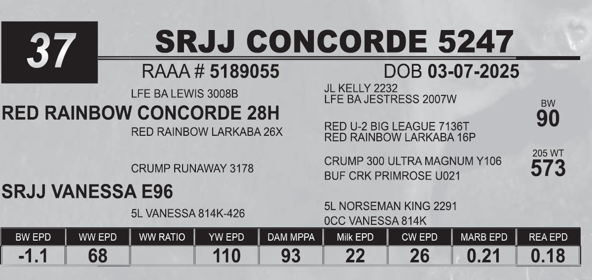 | SRJJ CONCORDE 5247 | 37 | Red Angus Yearling Bull | |