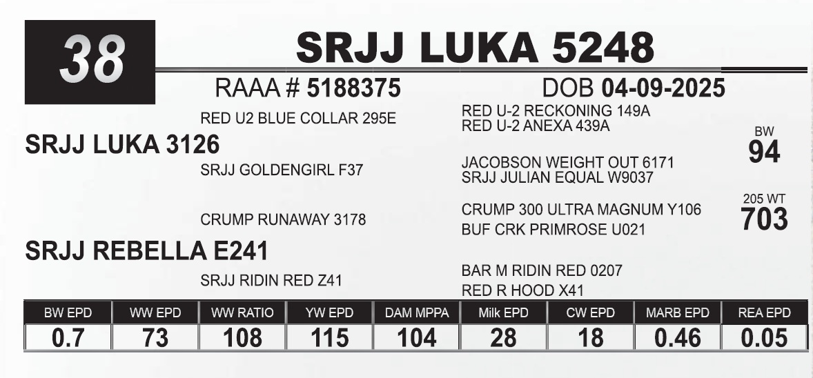 | SRJJ LUKA 5248 | 38 | Red Angus Yearling Bull | |