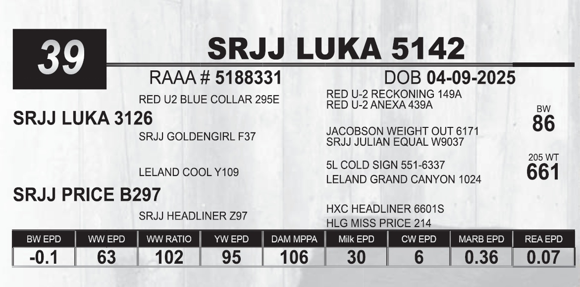 | SRJJ LUKA 5142 | 39 | Red Angus Yearling Bull | |