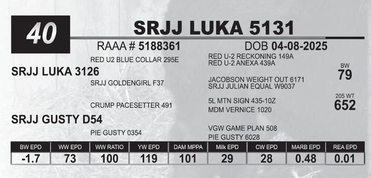 | SRJJ LUKA 5131 | 40 | Red Angus Yearling Bull | |