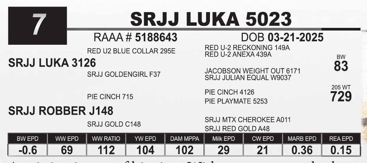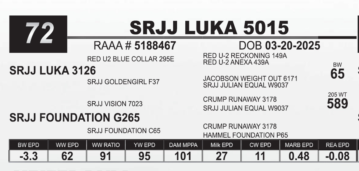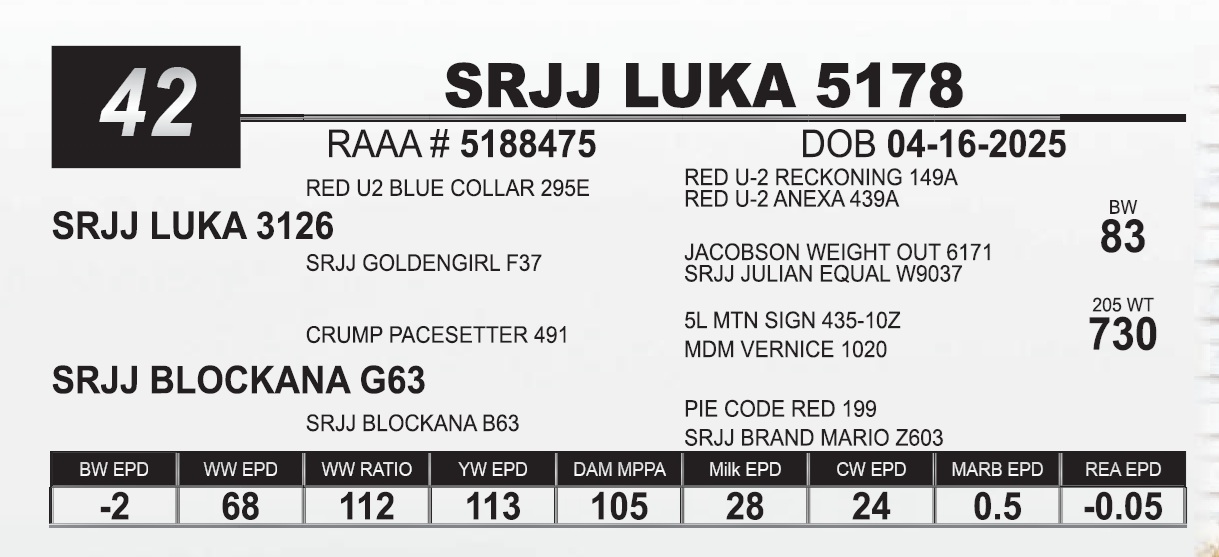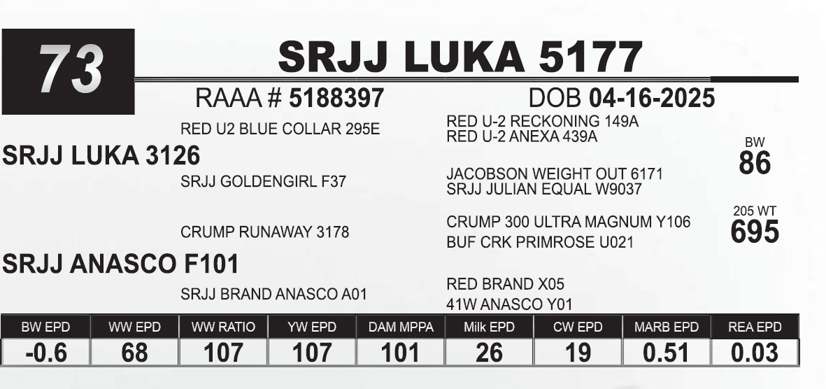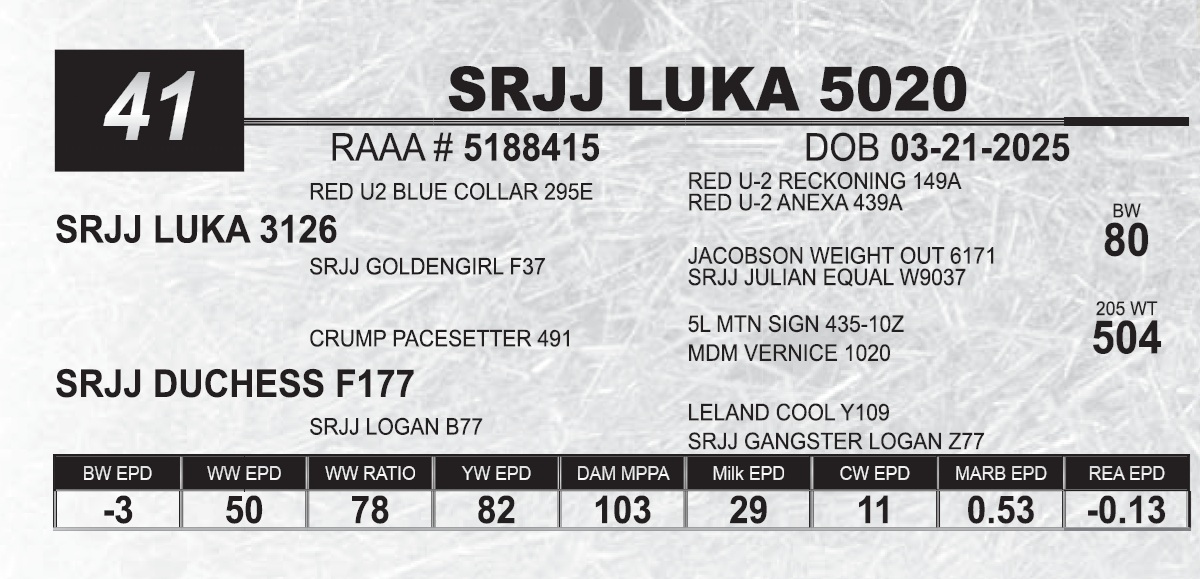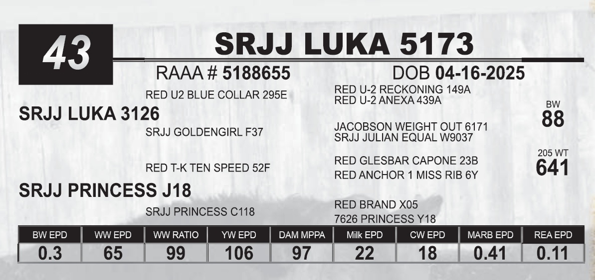 | SRJJ LUKA 5173 | 43 | Red Angus Yearling Bull | |
