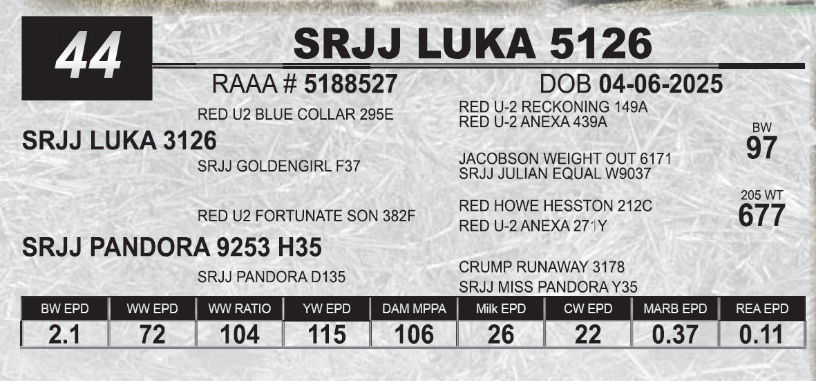 | SRJJ LUUKA 5126 | 44 | Red Angus Yearling Bull | |