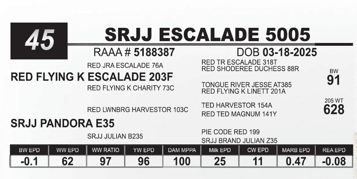 | SRJJ ESCALADE 5005 | 45 | Red Angus Yearling Bull | |